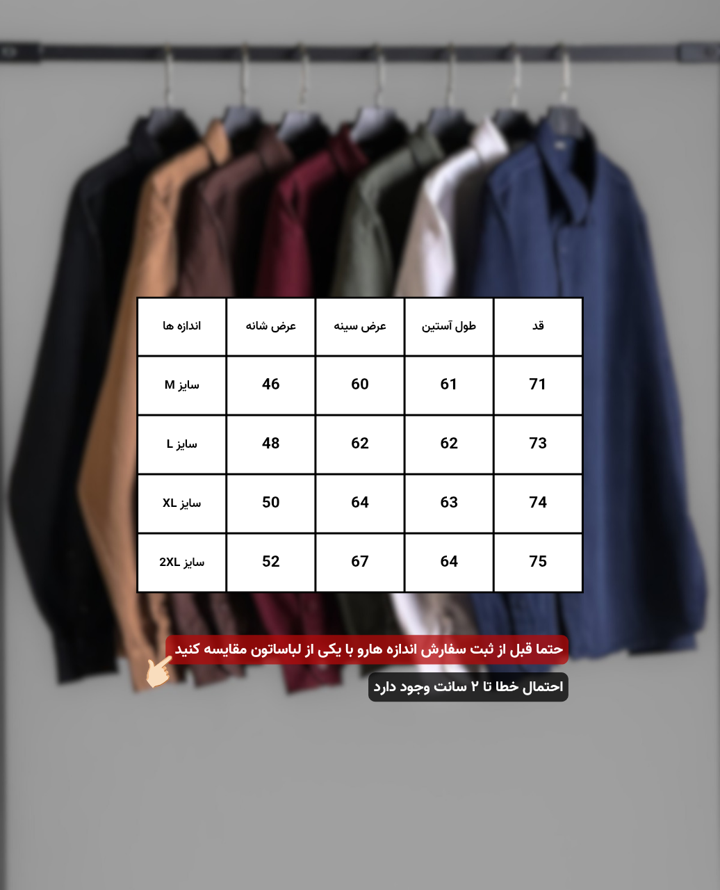 دقت فرمایید اختلاف سایزی بین 2 الی 3 سانت در راهنمای اندازه گیری طبیعی بوده و جز اشکال در اندازه گیری محسوب نمیشود.